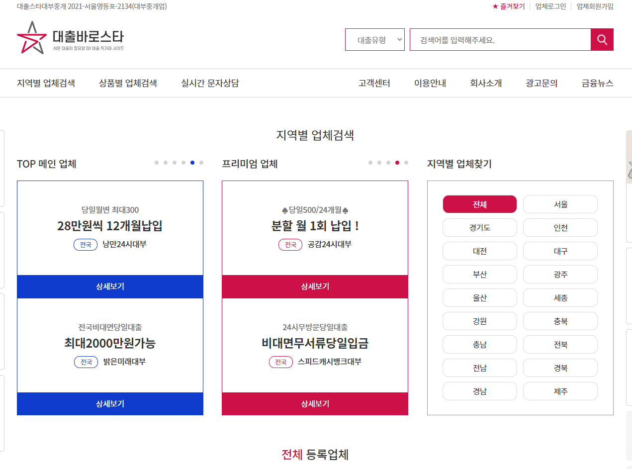 대출바로스타는 전국 700개 이상 다양한 개인돈 업체가 모여 있는 가장 유명한 중개플랫폼인데요. 다양한 대부업체가 등록되어 있으며 금융권 대출이 불가능한 분들이 많이 찾는 사이트입니다.